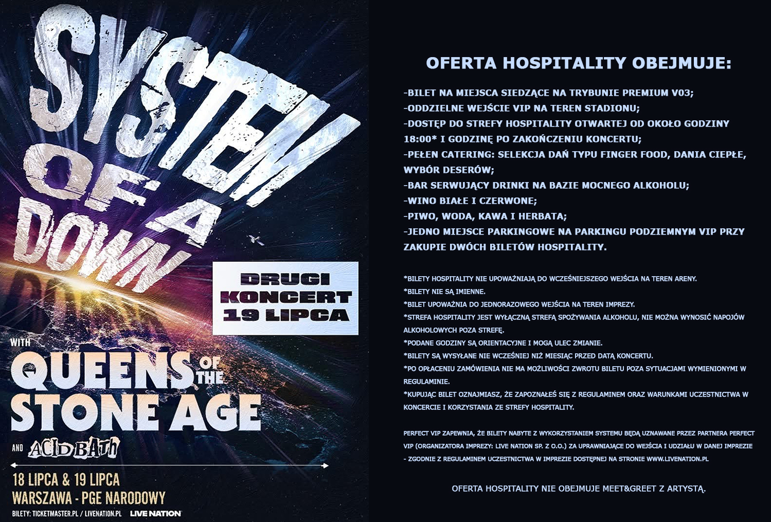 Perfect Vip zapewnia, że Bilety nabyte z wykorzystaniem Systemu będą uznawane przez partnera Perfect Vip (organizatora Imprezy: Live Nation sp. z o. o.) za uprawniające do wejścia i udziału w danej Imprezie - zgodnie z Regulaminem uczestnictwa w imprezie dostępnym na stronie www.livenation.pl.